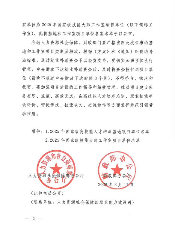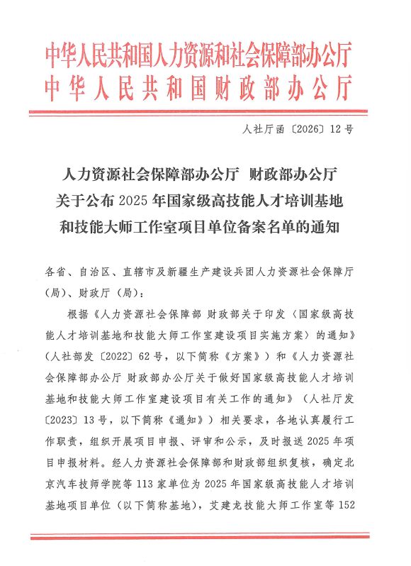 近日,人力资源社会保障部办公厅、财政部办公厅联合发布《关于公布2025年国家级高技能人才培训基地和技能大师工作室项目单位备案名单的通知》(人社厅函〔2026〕12号),周口技师学院成功入选2025年国家级高技能人才培训基地项目单位,项目类别为生产制造类,档次为A档,成为河南省豫东地区此次获批的首家单位,这是学院在高技能人才培养领域获得的国家级重要认可。